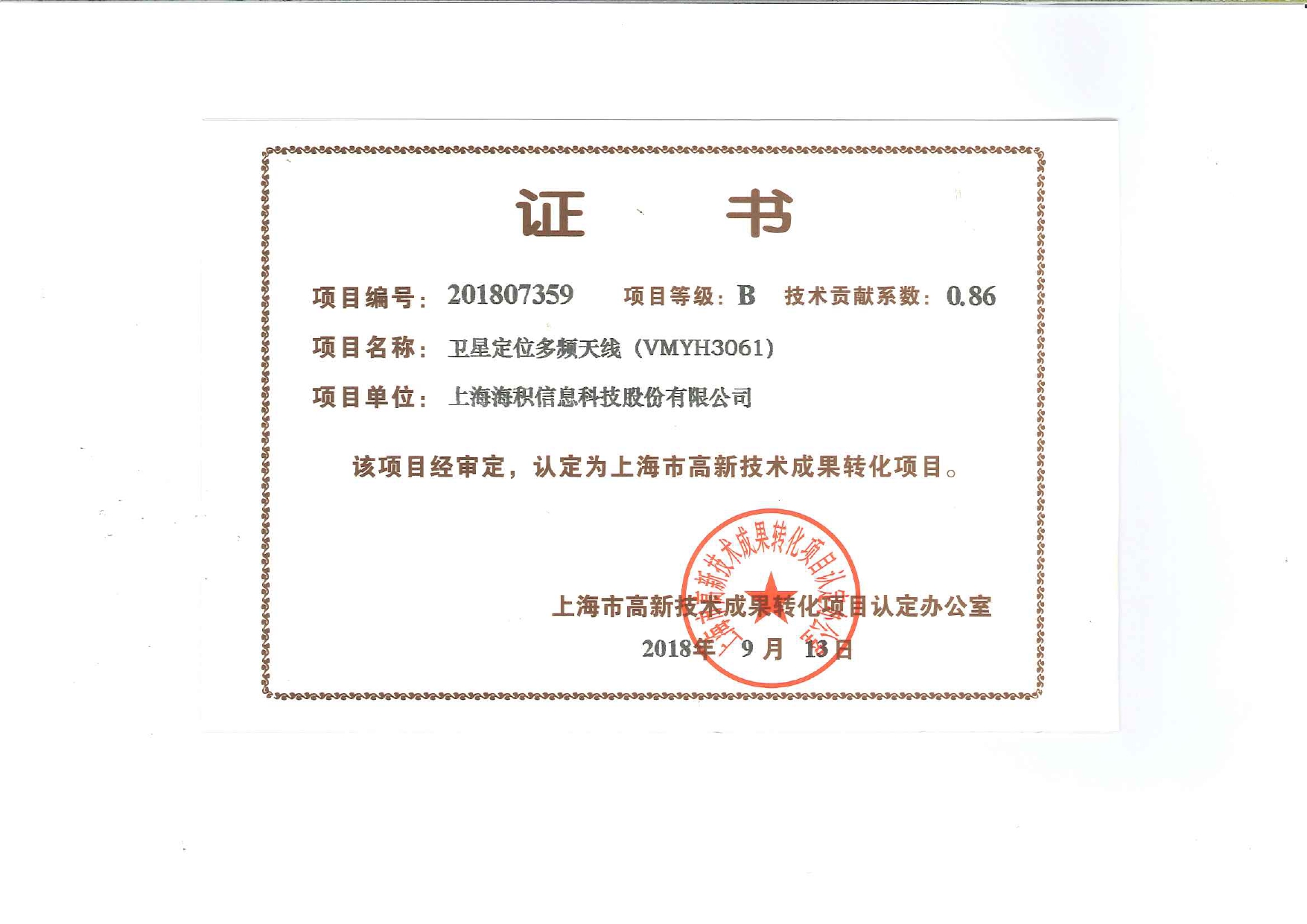 高新成果轉(zhuan)化證書-衛星定位(wei)多(duo)頻天線(VMYH3061)