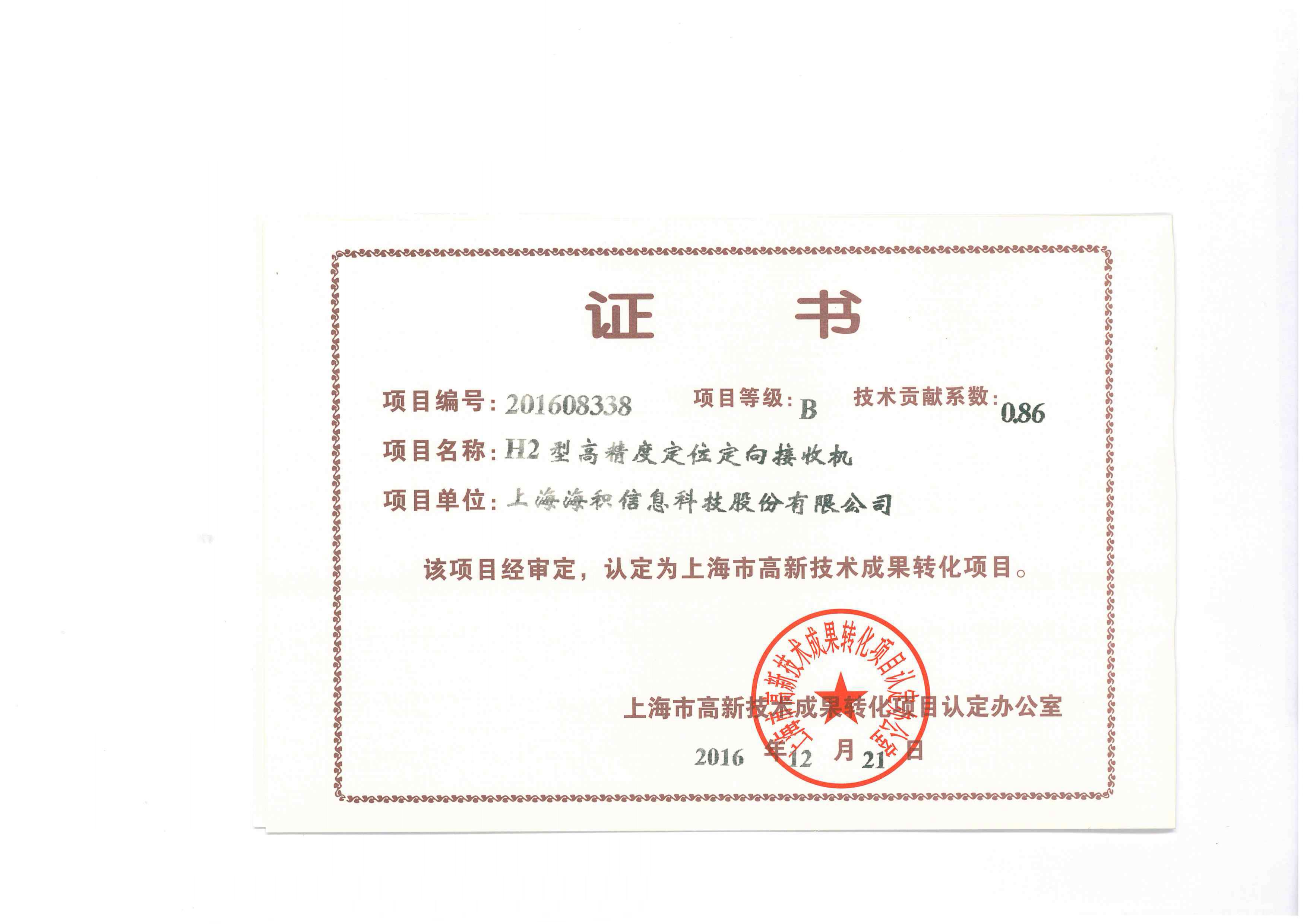 高新成果轉(zhuan)化證書(shu)-H2型高精(jing)度定位定向接收(shou)機(ji)
