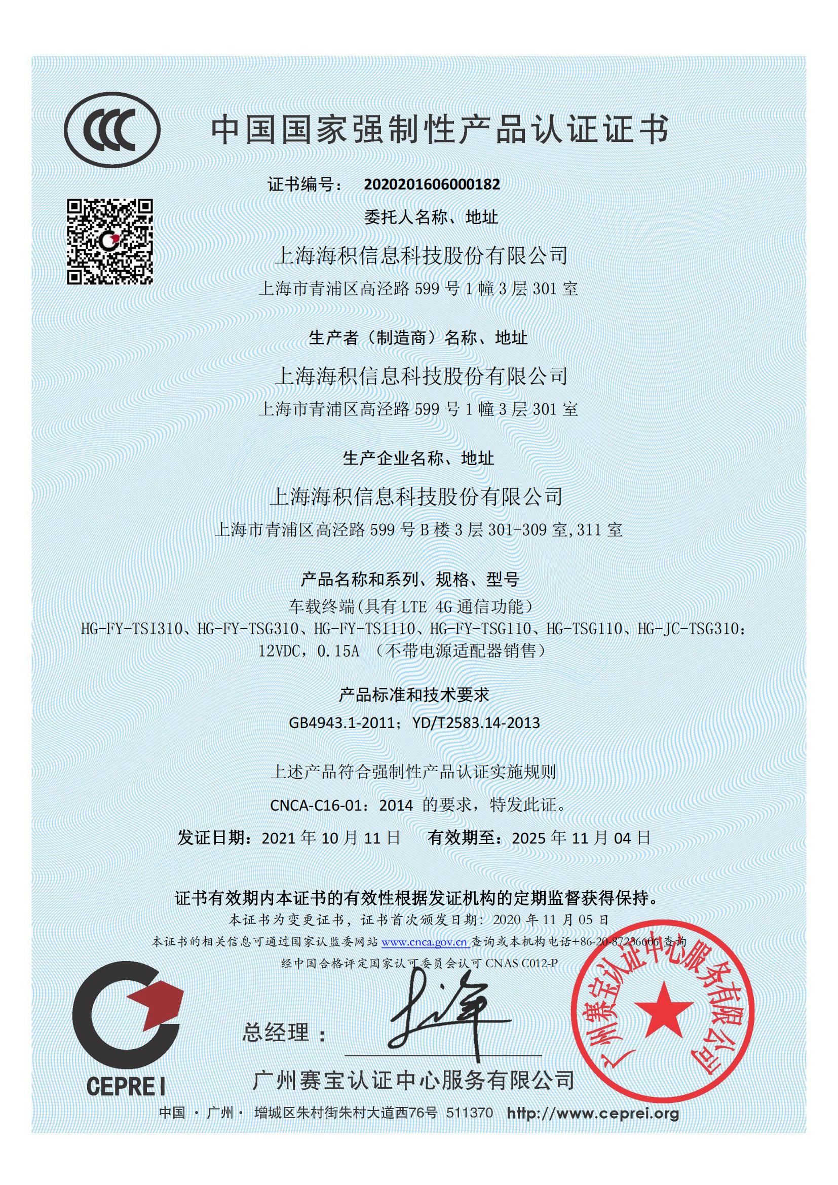 車(che)載終端(duan)(具有LTE 4G 通信(xin)功能) CCC認證(zheng)證(zheng)書