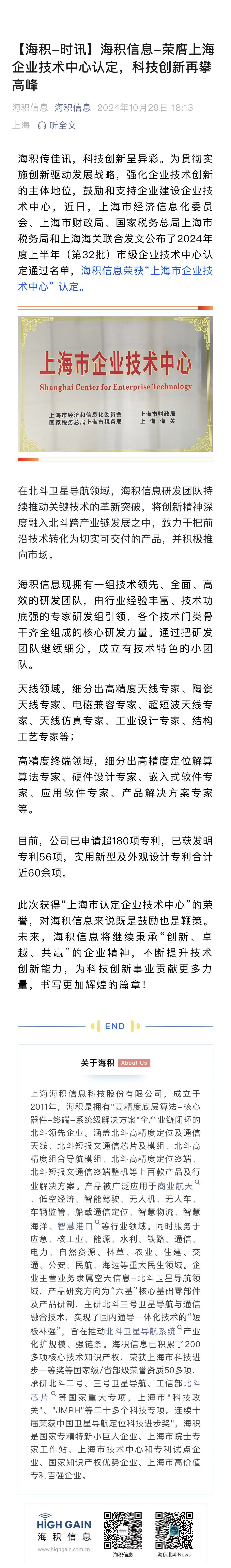 【海積-時訊】海積信息-榮膺上海企業技術中心認定,科技創新再攀高峰