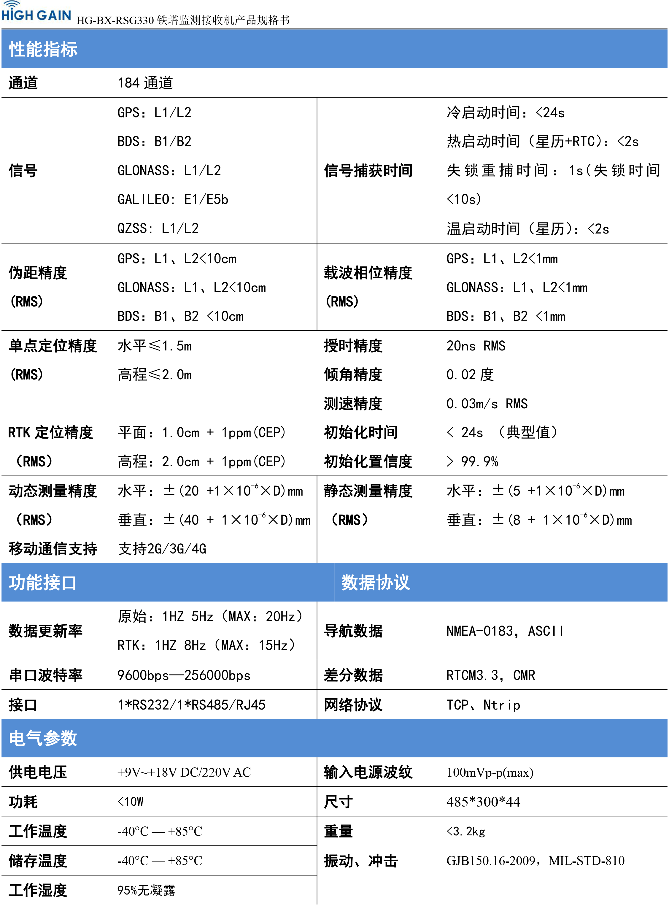 HG-BX-RSG330是(shi)海(hai)積(ji)(ji)信息公司自主研制開發的一款(kuan)全系統高精度(du)鐵(tie)塔(ta)監測接收(shou)機(ji),專門為(wei)滿足各種精確到mm級的定(ding)位精度(du)應用(yong)(yong)而設計(ji)。接收(shou)機(ji)采用(yong)(yong)分(fen)體式設計(ji),使(shi)海(hai)積(ji)(ji)信息的高精度(du)定(ding)位技術方便地外(wai)(wai)接傾(qing)角傳(chuan)感器(qi)(qi)應用(yong)(yong)于電(dian)力鐵(tie)塔(ta)傾(qing)斜測量(liang),可前(qian)端解算應用(yong)(yong)于位移形變量(liang)測量(liang)。外(wai)(wai)接風速、方向角傳(chuan)感器(qi)(qi)應用(yong)(yong)于風速的測量(liang)。