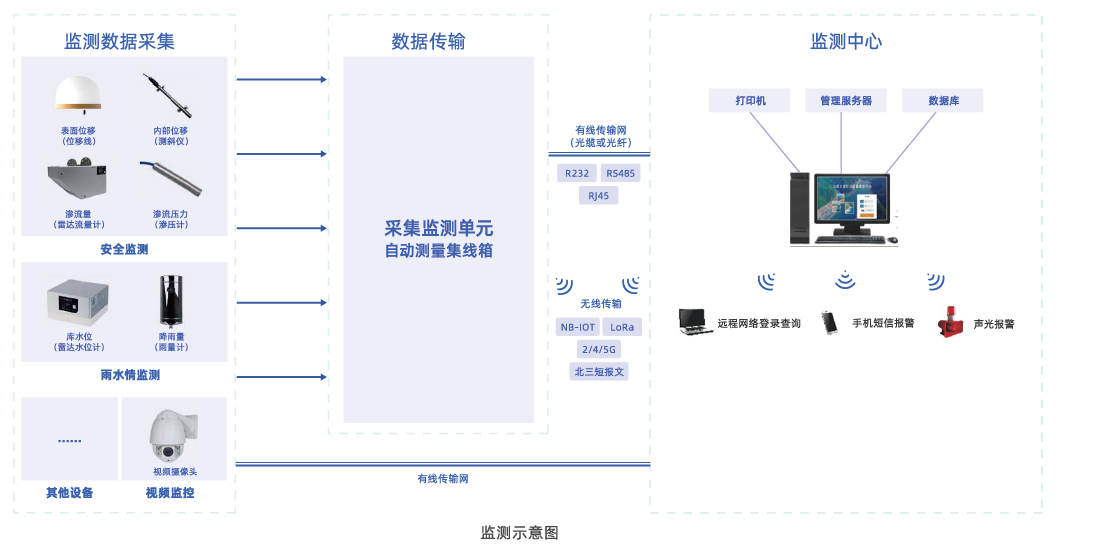 小(xiao)型水庫雨水情測(ce)報和(he)安(an)全監測(ce)系統(tong)由(you)四個子系統(tong)組成:前端(duan)數(shu)據采集(ji)子系統(tong)(數(shu)據采集(ji))、數據(ju)傳輸子系(xi)統(tong)(數據(ju)通(tong)訊)、數據(ju)處(chu)理分(fen)析及管理子系(xi)統(tong)(監(jian)(jian)控中心(xin)),輔(fu)助(zhu)子系(xi)統(tong)(供電防雷等)。四個子系(xi)統(tong)有機結合形成一個整體(ti),前端數據(ju)采(cai)集子系(xi)統(tong)實時跟蹤GNSS衛星及各(ge)類(lei)監(jian)(jian)測終(zhong)端設備并(bing)實時采(cai)集數據(ju),數據(ju)由通(tong)訊網絡傳輸至監(jian)(jian)測中心(xin),監(jian)(jian)測中心(xin)軟件對數據(ju)進行處(chu)理分(fen)析,實時監(jian)(jian)測隱(yin)患點(dian)位移情(qing)況,一旦(dan)監(jian)(jian)測數據(ju)出(chu)現異(yi)常,預(yu)警系(xi)統(tong)立即(ji)作出(chu)相應(ying)的預(yu)警反應(ying)。