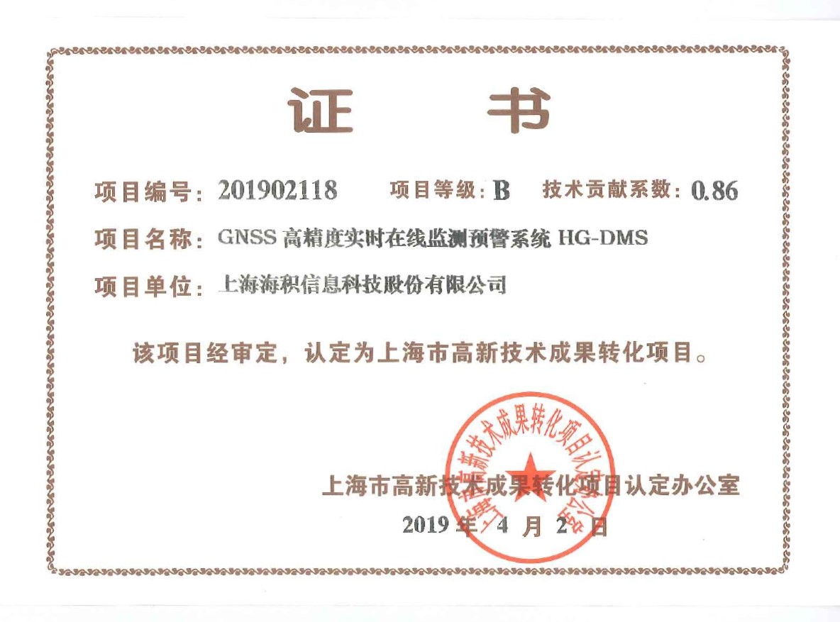 高新成(cheng)果轉化證書-GNSS高精(jing)度實時在線監測(ce)預警系統 HG-DMS