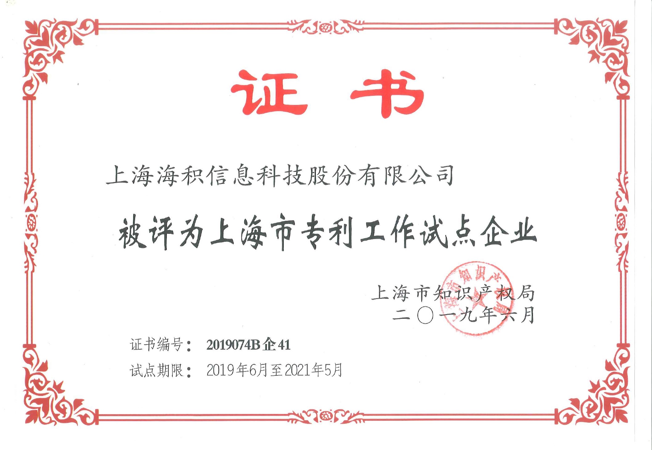上海市專(zhuan)利(li)工(gong)作(zuo)試點(dian)企業證書