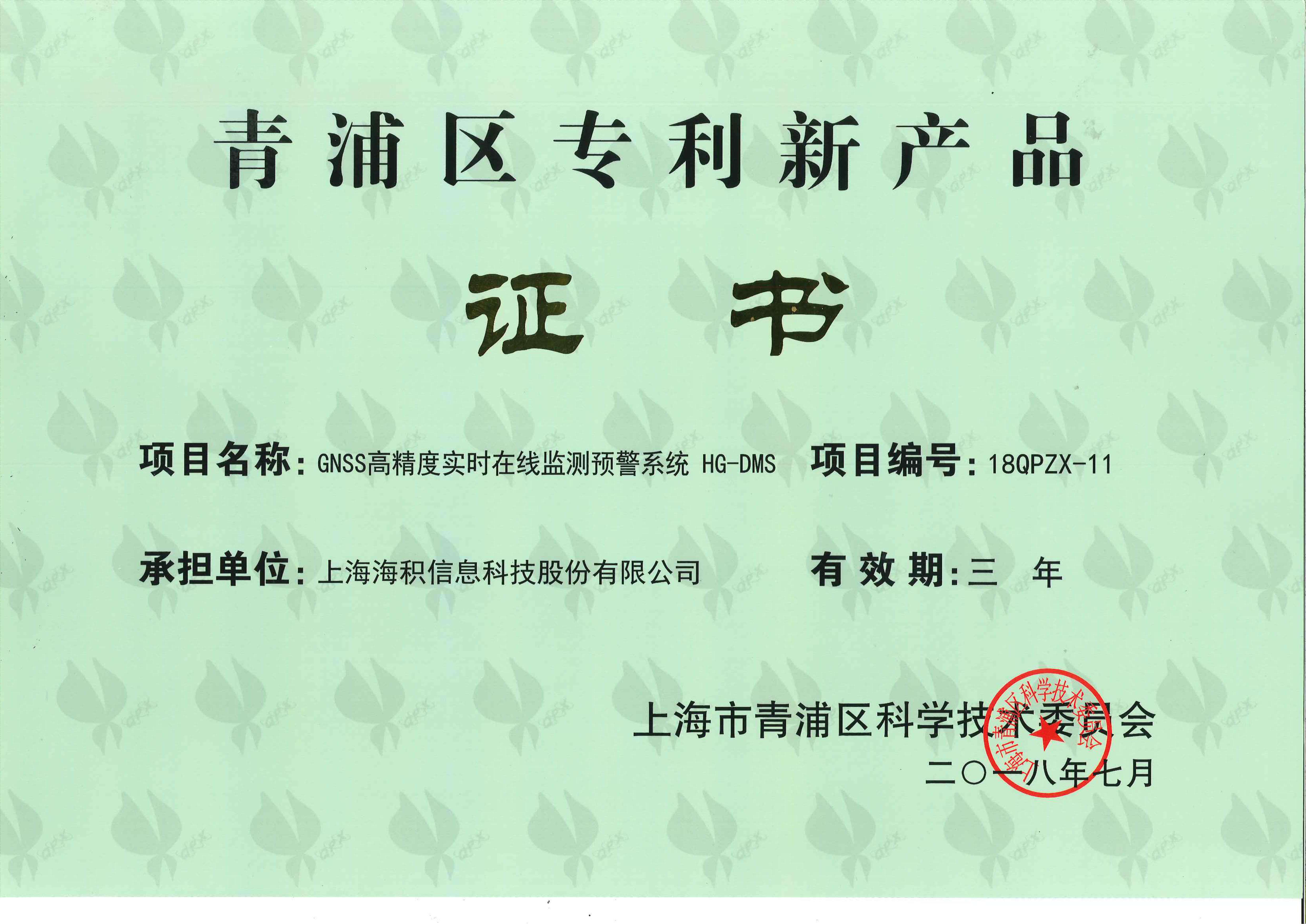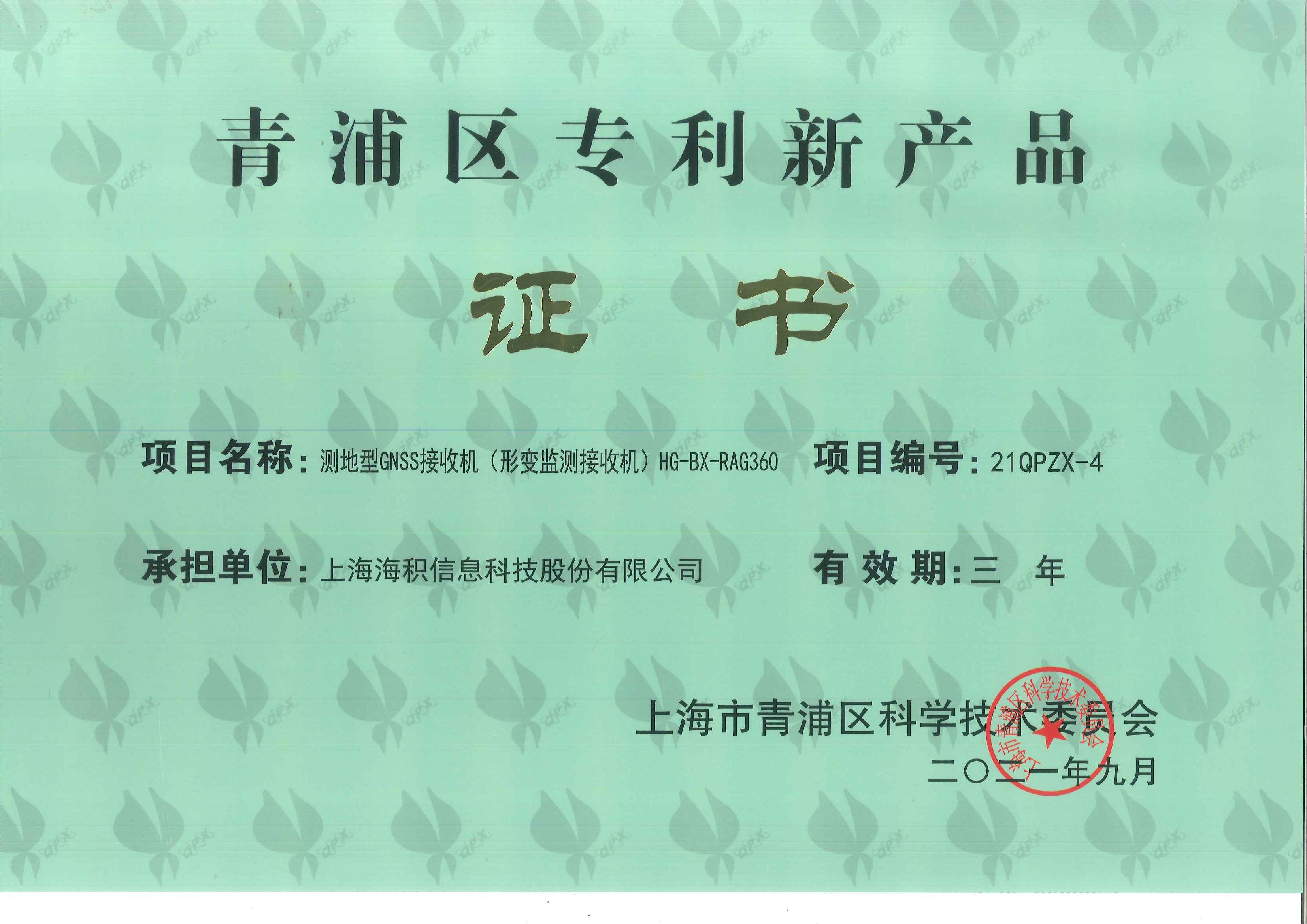 青(qing)浦區(qu)專(zhuan)利新品(pin)證書-測(ce)地(di)型GNSS接收機(形變監(jian)測(ce)接收機)HG-BX-RAG360