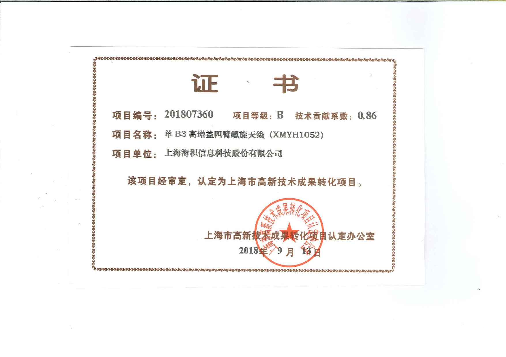 高新成果轉(zhuan)化證書-衛星定位(wei)多(duo)頻天線(VMYH3061)