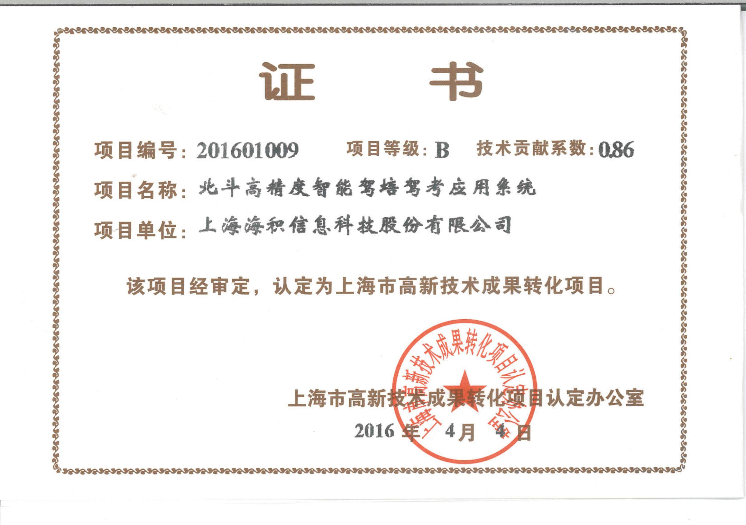 高(gao)新成果轉(zhuan)化證(zheng)書(shu)-北斗高(gao)精度智能(neng)駕培駕考應用(yong)系統(tong)