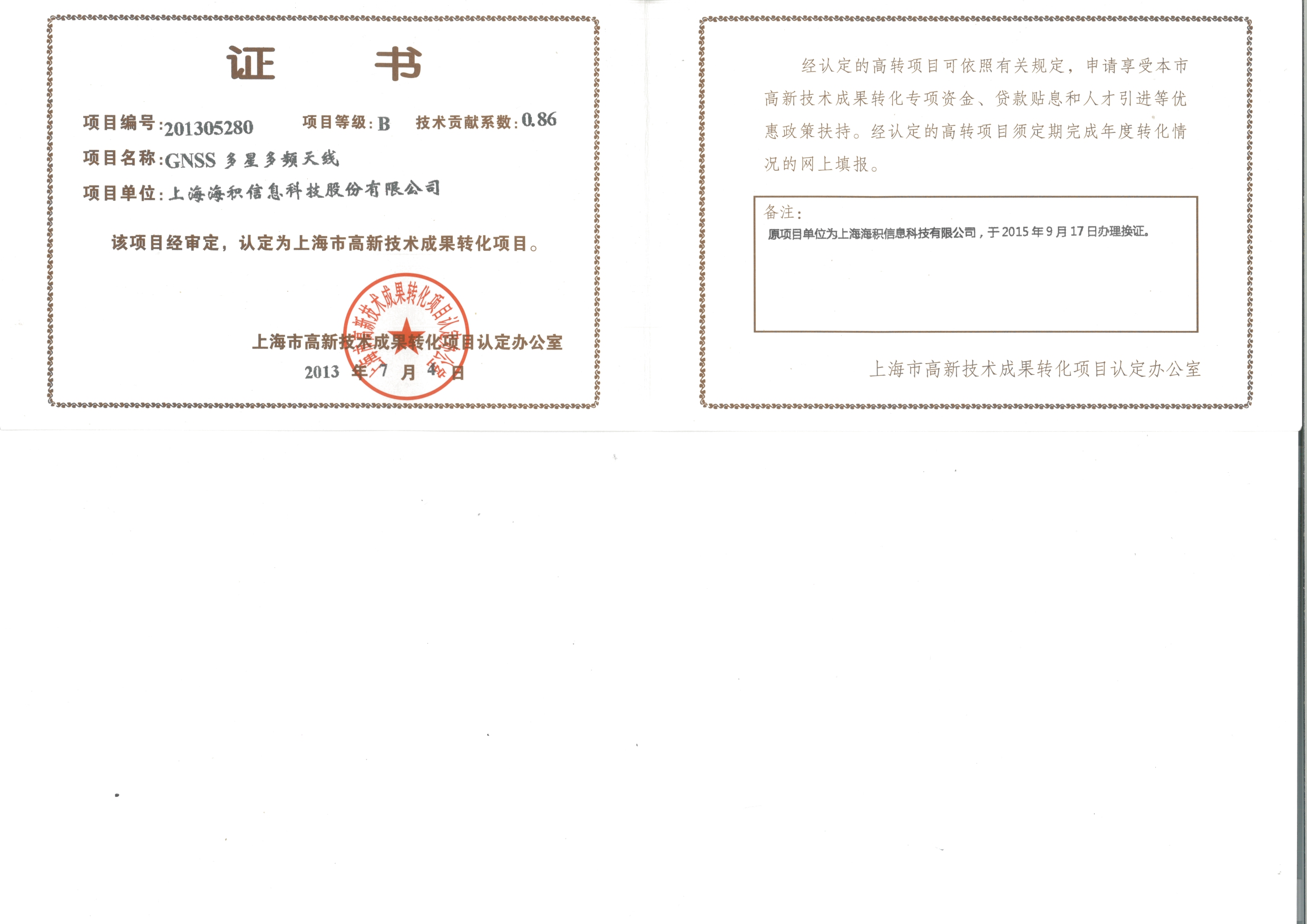 高(gao)新(xin)成(cheng)果轉化證書-GNSS多星多頻(pin)天線