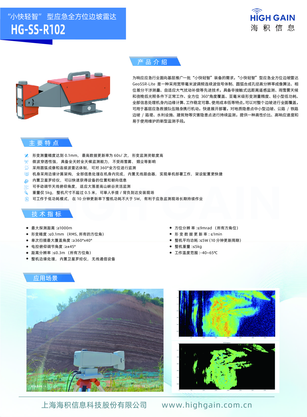 形變(bian)測(ce)量(liang)精(jing)度達(da)到0.1mm,最高數據(ju)更新率為60s/次,形變(bian)監測(ce)靈敏度高 微波穿透性強,具備全(quan)天(tian)時全(quan)天(tian)候(hou)監測(ce)能力,不受雨雪霧、煙塵(chen)等影(ying)響 采(cai)用圓(yuan)弧成像(xiang)和連續波雷達(da)體制,可(ke)對360°全(quan)方位進行監測(ce) 機身采(cai)用邊緣計算架構,全(quan)部信息(xi)處理在(zai)機身內(nei)完成,內(nei)置無線路由器,實現單機部署工作,架設配置更快(kuai)捷(jie) 內(nei)置衛星羅經儀,可(ke)以快(kuai)速(su)獲得設備的位置和朝向(xiang)信息(xi) 可(ke)手動調節(jie)天(tian)線俯(fu)仰角度,適應大落差(cha)高山峽(xia)谷靈活監測(ce) 重量(liang)僅5kg,整機尺寸不超過0.5米 可(ke)工作于低(di)功耗模式